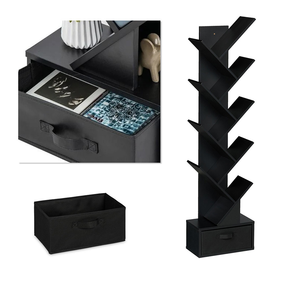 Knižnica má celkom 10 otvorených priehradiek, ideálnych na knihy, rastliny alebo dekoratívne predmety. Textilná zásuvka umiestnená na dne umožňuje diskrétne uskladnenie – ak je to potrebné, môžete ju odstrániť pre ďalší otvorený priestor na polici.