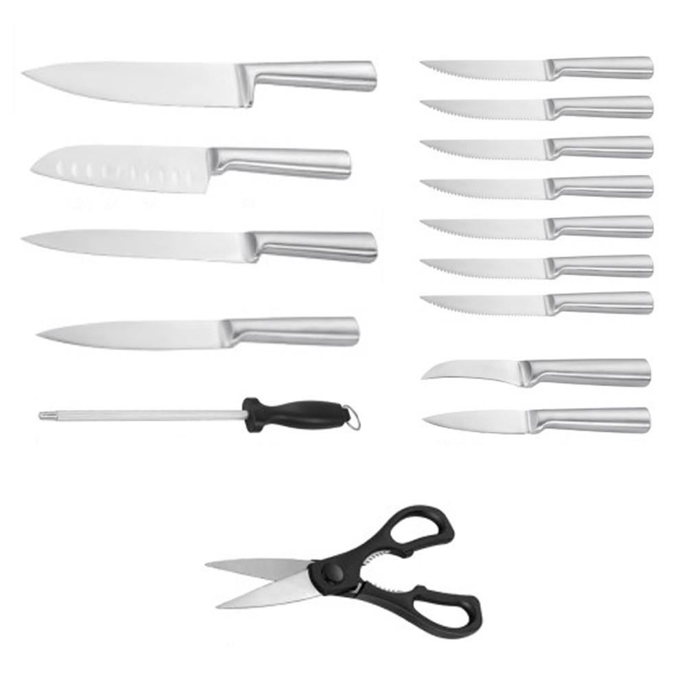 Sada obsahuje 6 steakových nožov, šéfkuchársky nôž, japonský nôž, univerzálny nôž, 2 nože na šúpanie, 6 steakových nožov, brúska, nožnice a drevený blok.