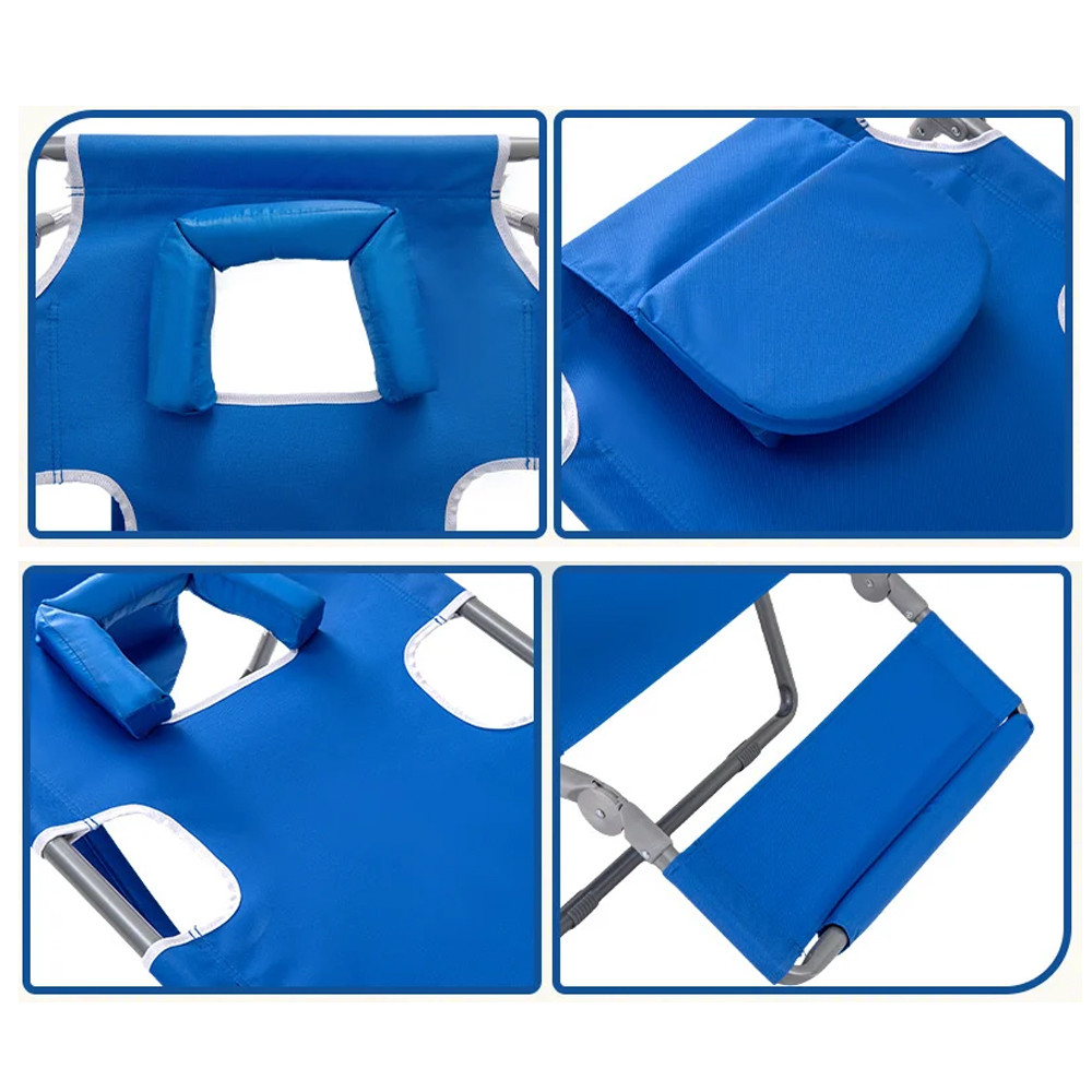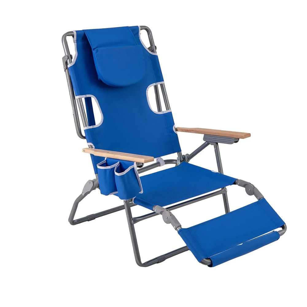 Modré poťahové látky dávajú svieži letný vzhľad a kovový rám zabezpečuje stabilnú oporu. Drevené podrúčky sú príjemné na dotyk, čo uľahčuje sadanie a vstávanie a poskytuje pohodlie počas oddychu.