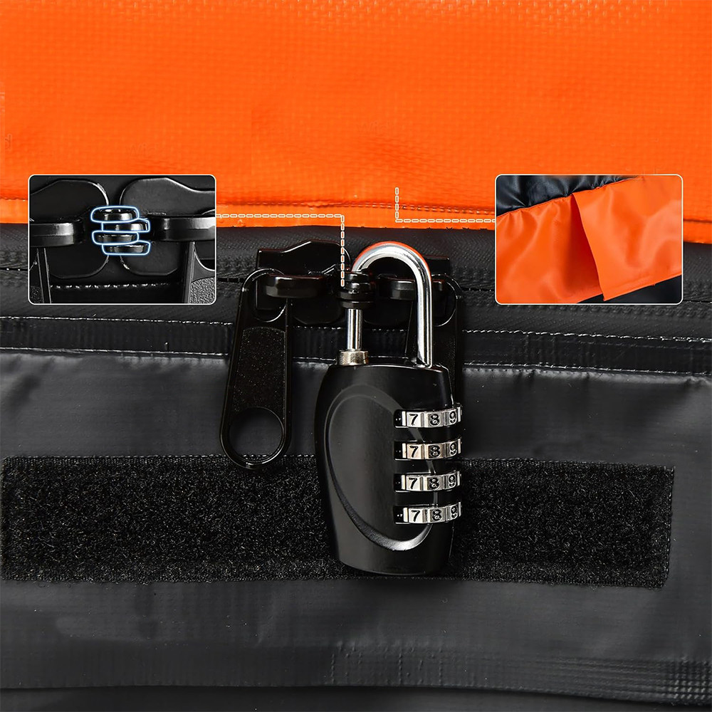 Vyrobená z trojvrstvového, vysoko hustého PVC materiálu, je odolná voči vode, prachu a UV žiareniu. 11 cm dažďová clona so suchým zipsom zabraňuje prenikaniu vody cez zips, čím chráni vaše veci pred dažďom, snehom a vetrom. 4-ciferný kombinovaný zámok poskytuje dodatočnú bezpečnosť.