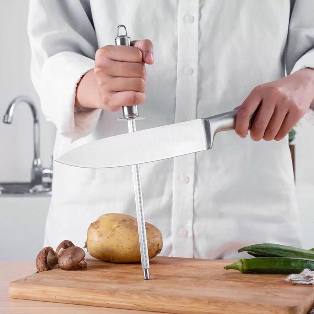 Či už krájate, škrabete alebo sekáte, táto súprava obsahuje všetko potrebné – sekáč, nôž na chlieb, krájací, univerzálny a škrabací nôž, nožnice a brúska. Ergonomická rukoväť zaisťuje pohodlný a bezpečný úchop aj pri dlhšej príprave jedál.