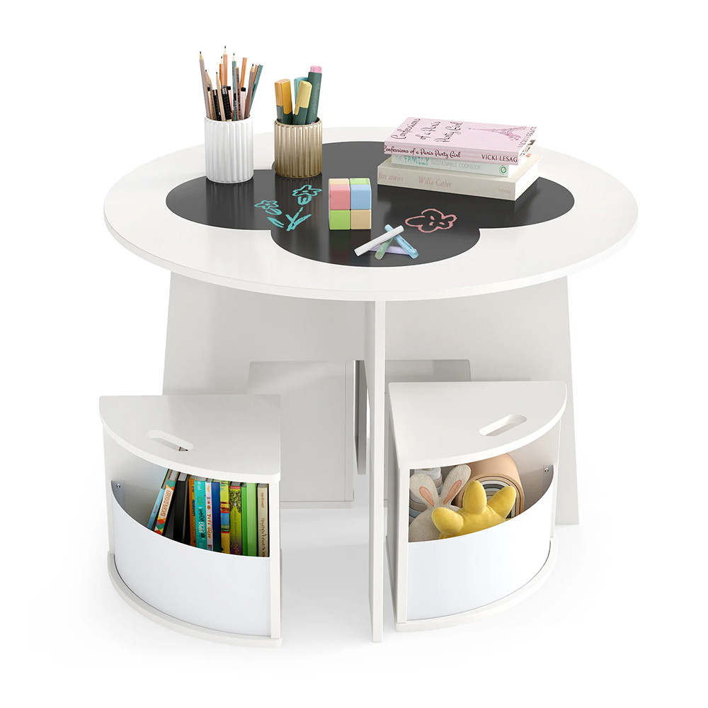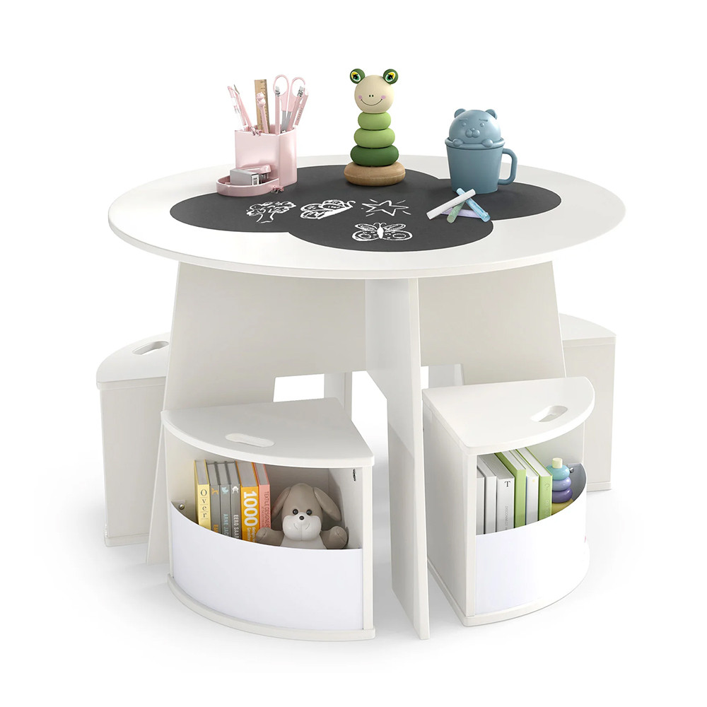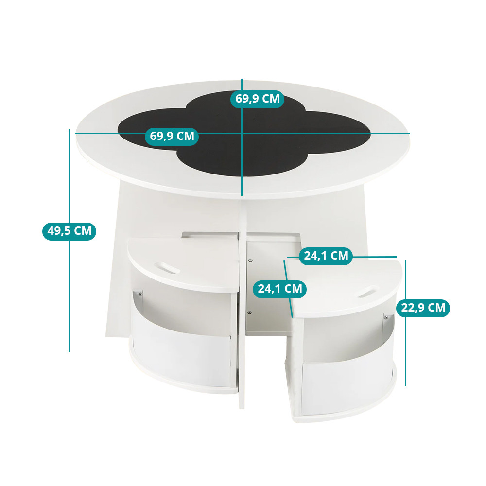 Stolčeky možno po použití jednoducho zasunúť pod stôl, takže nezaberajú zbytočné miesto. V zabudovaných úložných priestoroch rýchlo schováte knihy, kresliace potreby a malé hračky, keď chcete udržať poriadok.