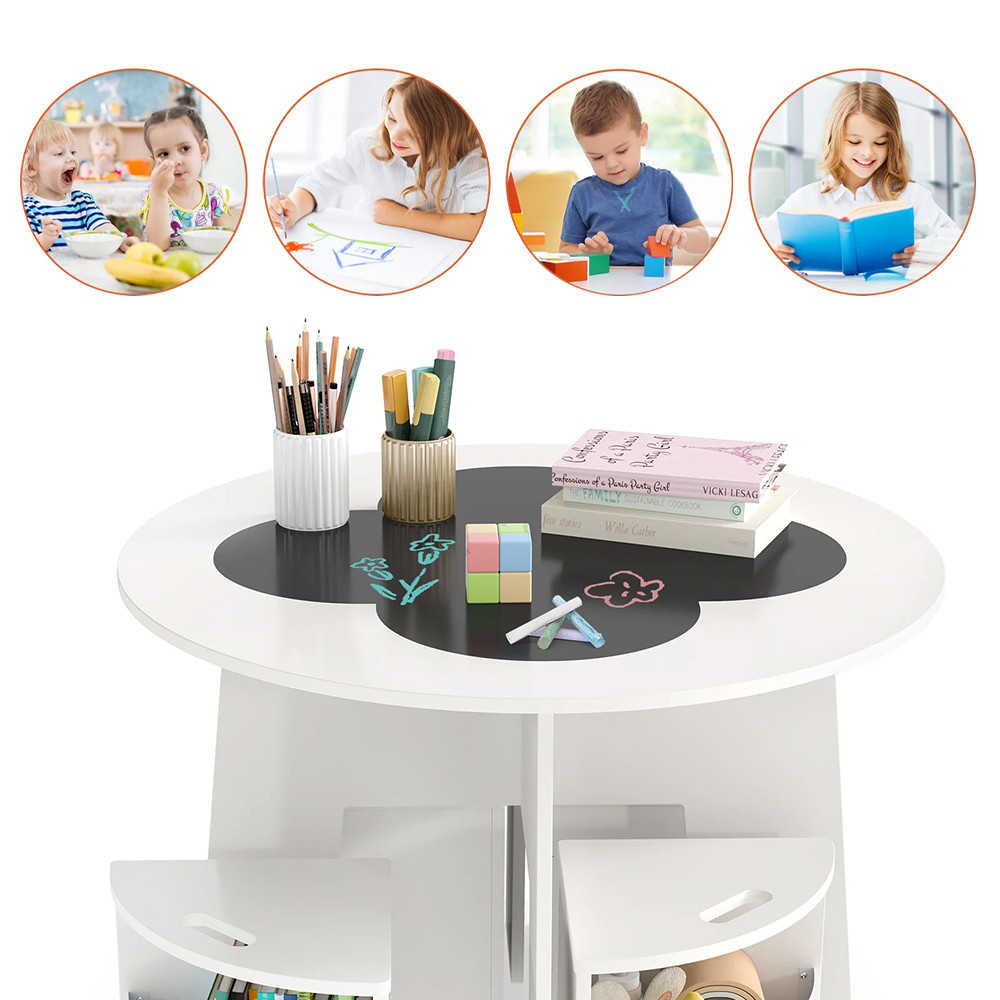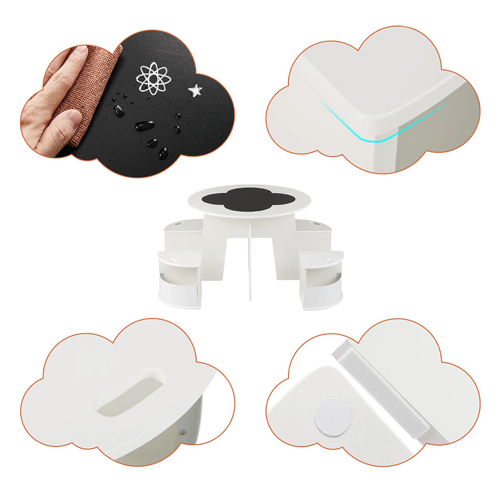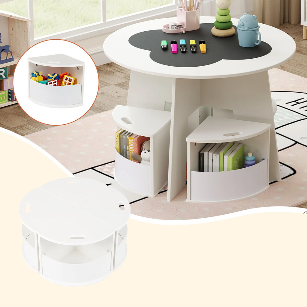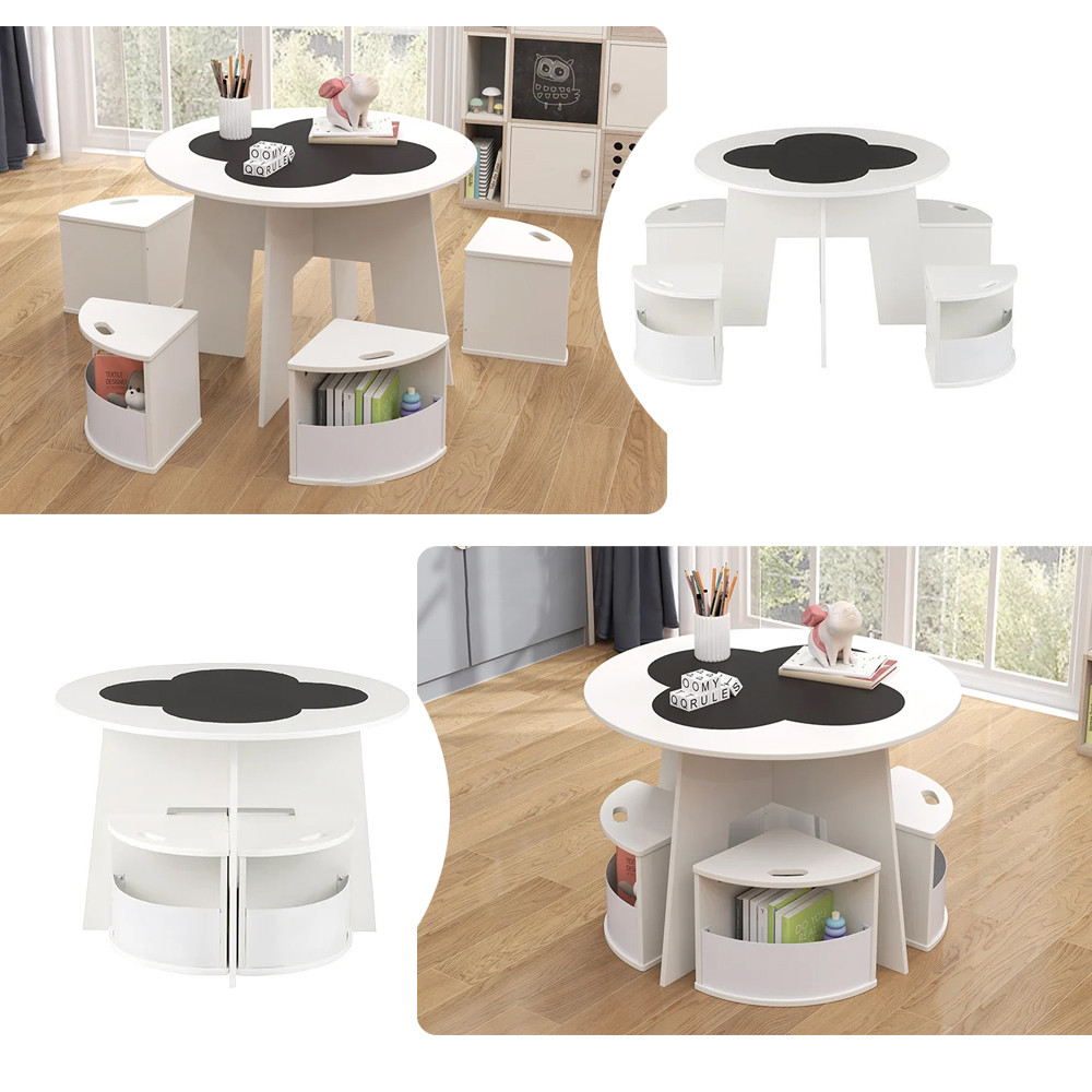 Stolčeky možno po použití jednoducho zasunúť pod stôl, takže nezaberajú zbytočné miesto. V zabudovaných úložných priestoroch rýchlo schováte knihy, kresliace potreby a malé hračky, keď chcete udržať poriadok.