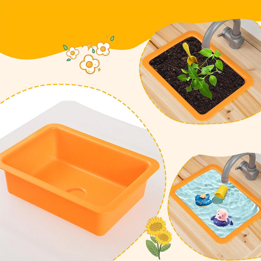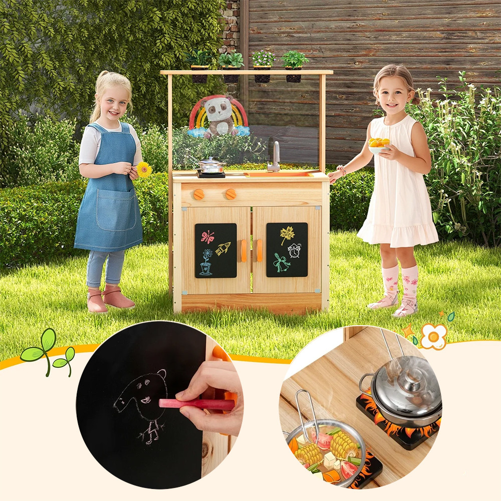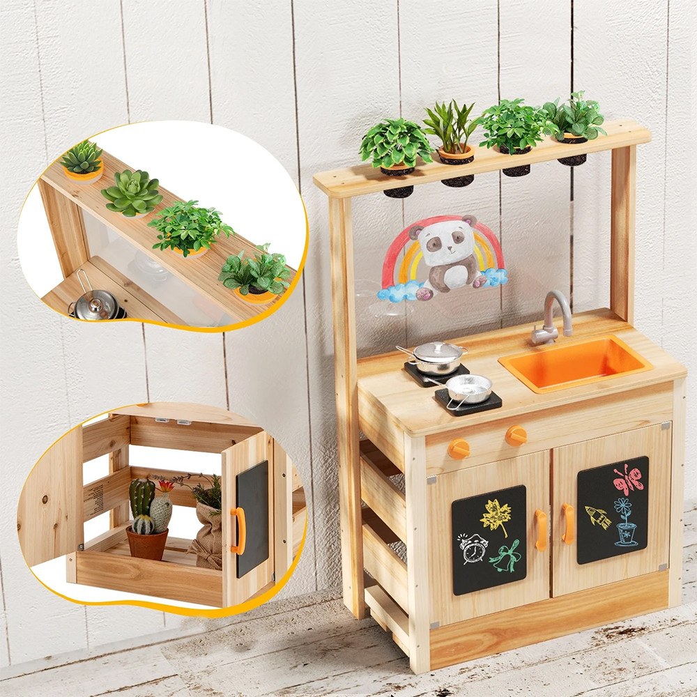 Tento drevený hrací stôl z borovice ponúka ideálne prostredie pre vonkajšie hry. Realistické prvky – ako sporák, otáčacie gombíky, umývadlo a kuchynské náradie – umožňujú deťom ponoriť sa do hrania rolí, zatiaľ čo rozvíjajú svoje jemné motorické zručnosti a predstavivosť.