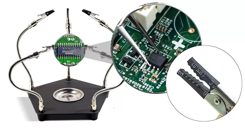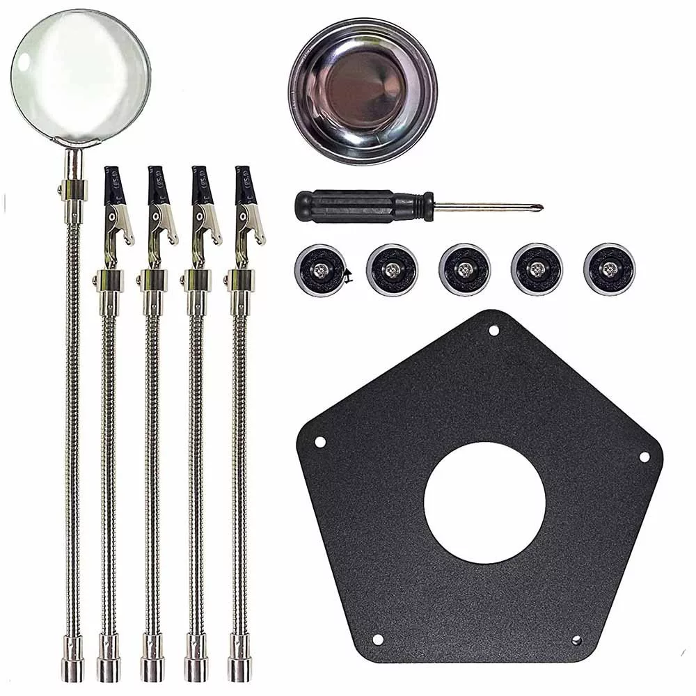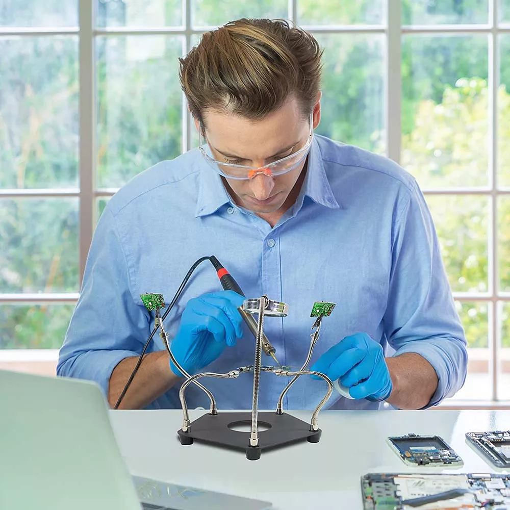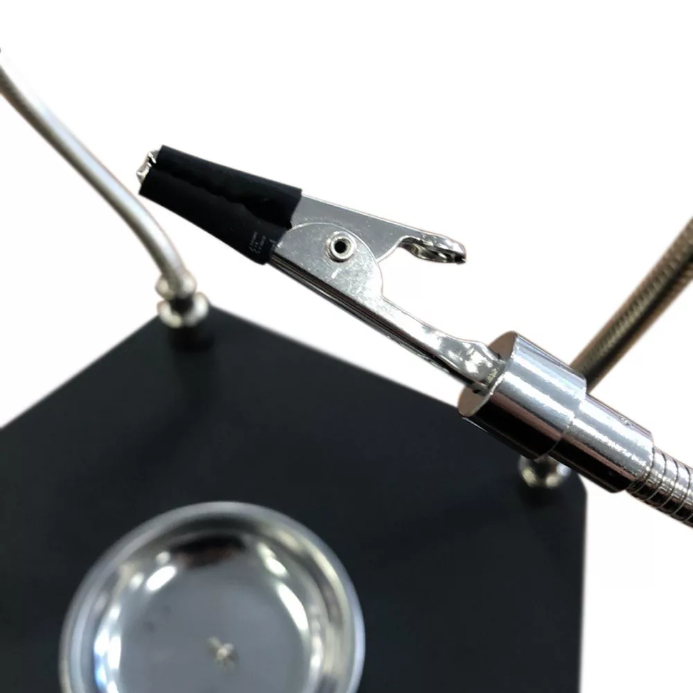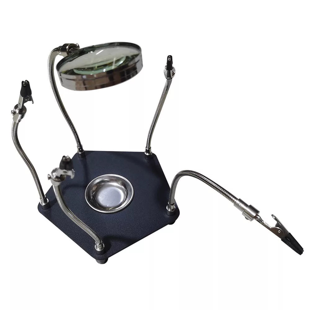 Držiak na plošné spoje s klipmi a lupou je ideálnou voľbou pre elektronické práce. Nastaviteľné klipové ramená umožňujú stabilné uchytenie komponentov, zatiaľ čo lupa pomáha pri presnom sledovaní detailov. Protišmyková základňa zaručuje stabilitu, čo poskytuje pohodlné a bezpečné pracovné podmienky.