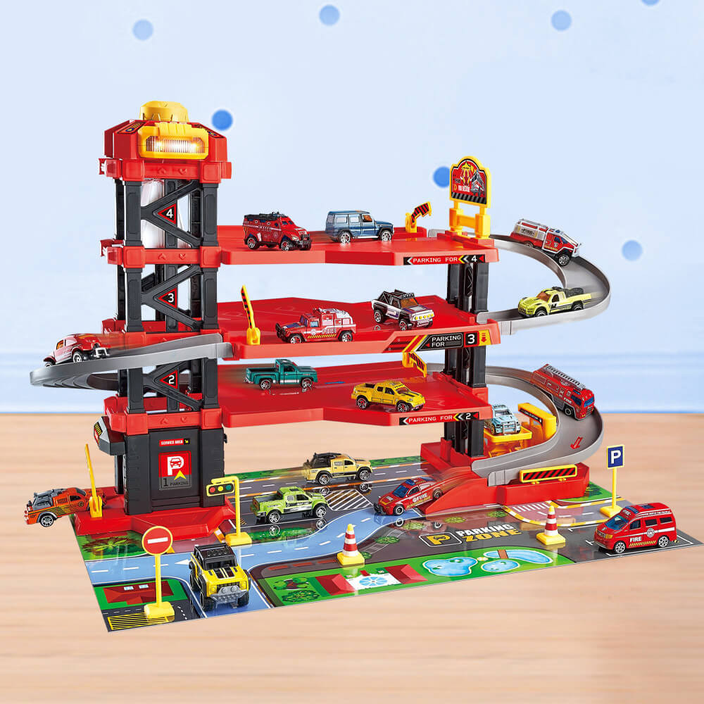 Vďaka viacposchodovému dizajnu hasičskej garáže si deti užijú dlhé hodiny zábavy. Autíčka môžu plynulo jazdiť medzi poschodiami, čo udržiava hru v neustálom pohybe – či už ide o hasenie požiarov alebo riadenie dopravy.