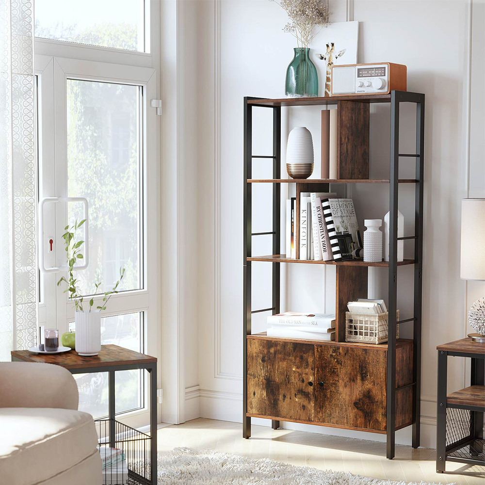 Štyri otvorené police ponúkajú dostatok miesta na knihy, rastliny alebo dekorácie, zatiaľ čo spodná dvojdverová skrinka ukryje menej dekoratívne predmety. Bočné krížové lišty bránia skĺznutiu kníh a môžu poslúžiť aj na zavesenie slúchadiel alebo drobných doplnkov.