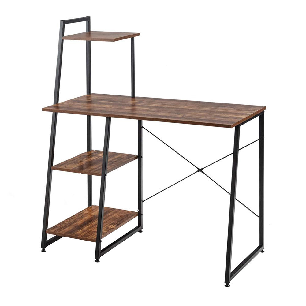 Počítačový stôl je vybavený tmavou drevenou doskou a policami, ktoré sú podporované pevným kovovým rámom. Tento kombinovaný materiál poskytuje moderný minimalistický vzhľad, ktorý sa hodí do akéhokoľvek pracovného prostredia – či už do domácej kancelárie alebo profesionálnej pracovnej miestnosti.