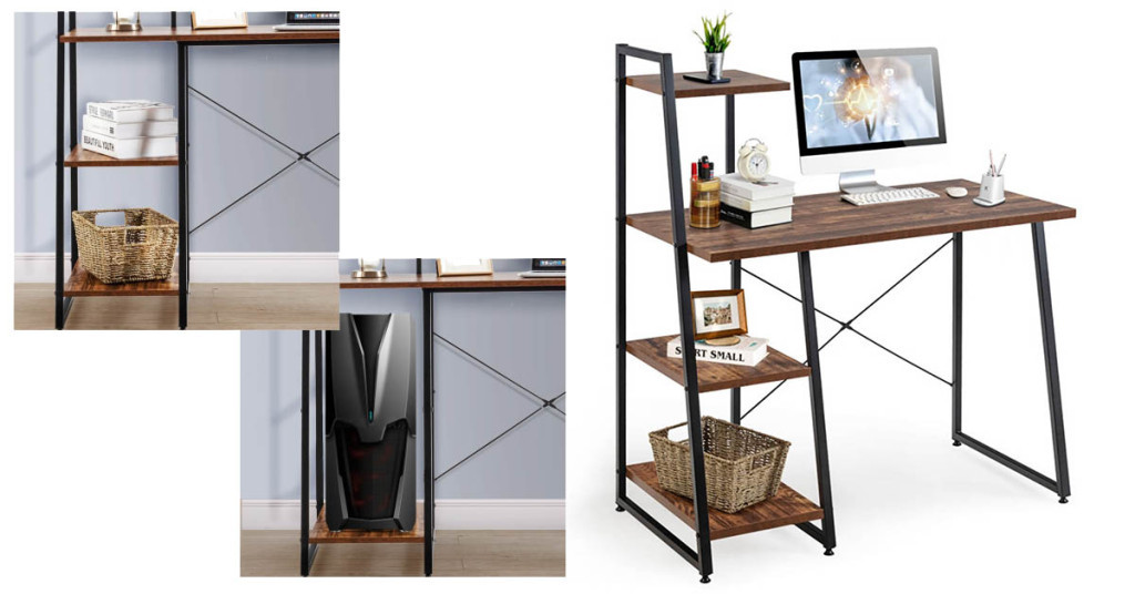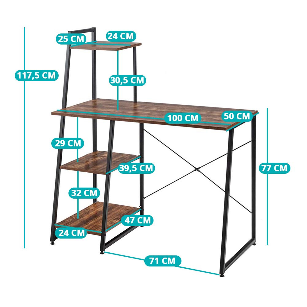 Stôl je vybavený 4 policami, ktoré umožňujú pohodlné uskladnenie pracovných nástrojov, dokumentov alebo dekorácií. Menšie a väčšie police zabezpečujú dostatok úložného priestoru, pričom spodné police sú ideálne na knihy alebo organizéry. Police sú dostatočne silné na uloženie ťažších predmetov.
