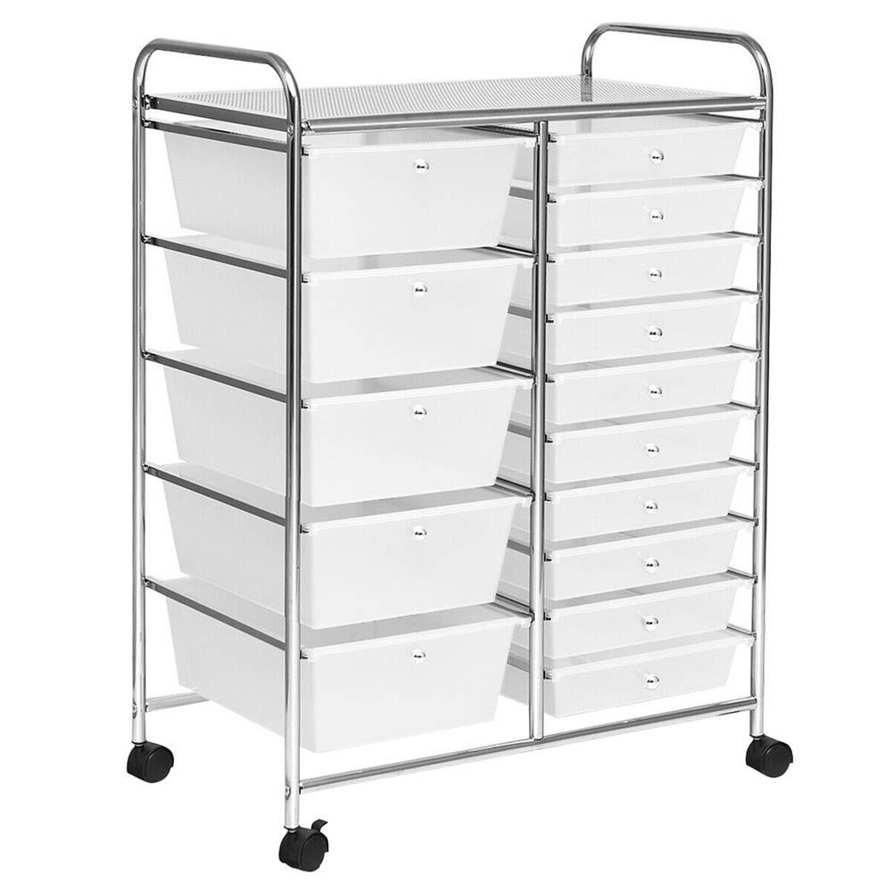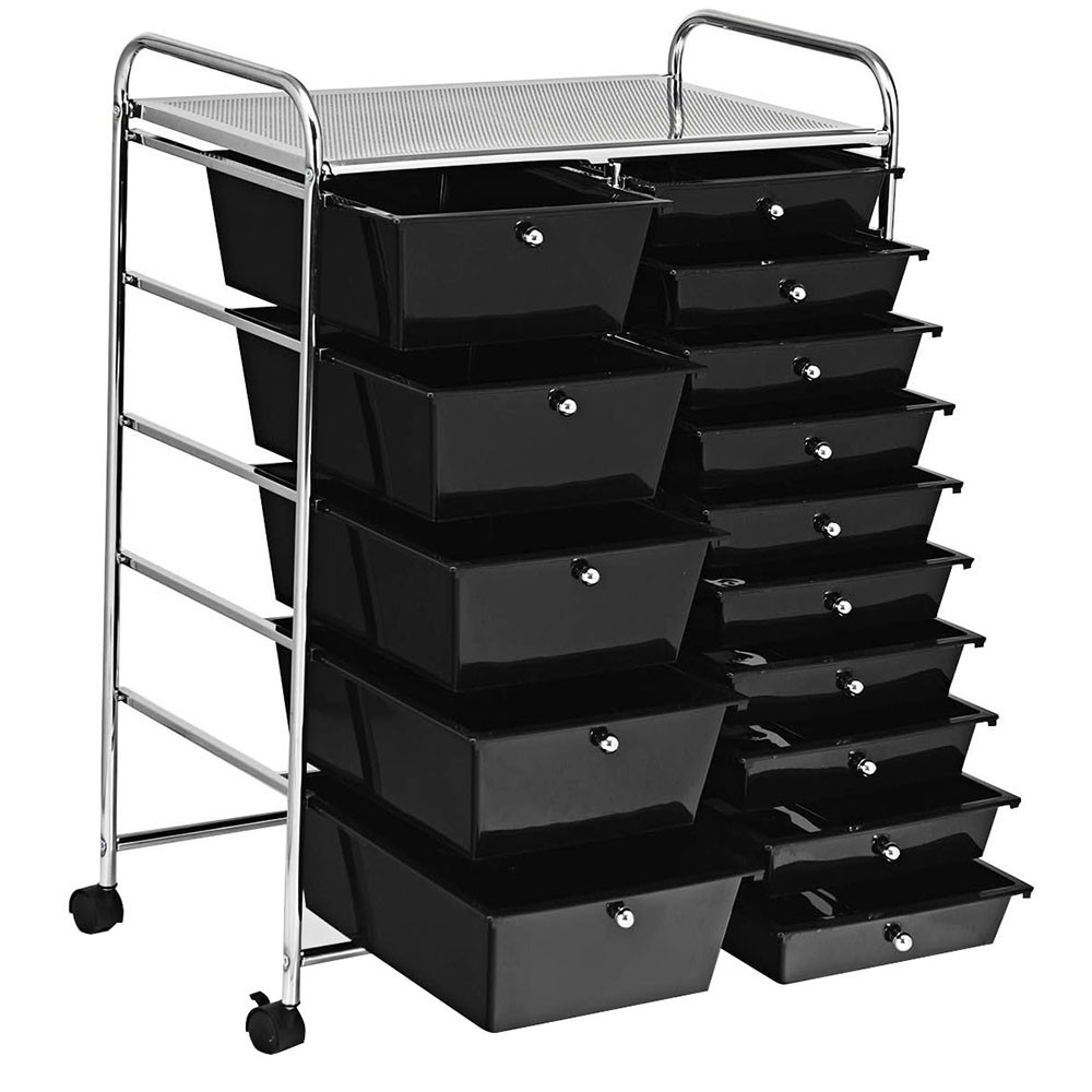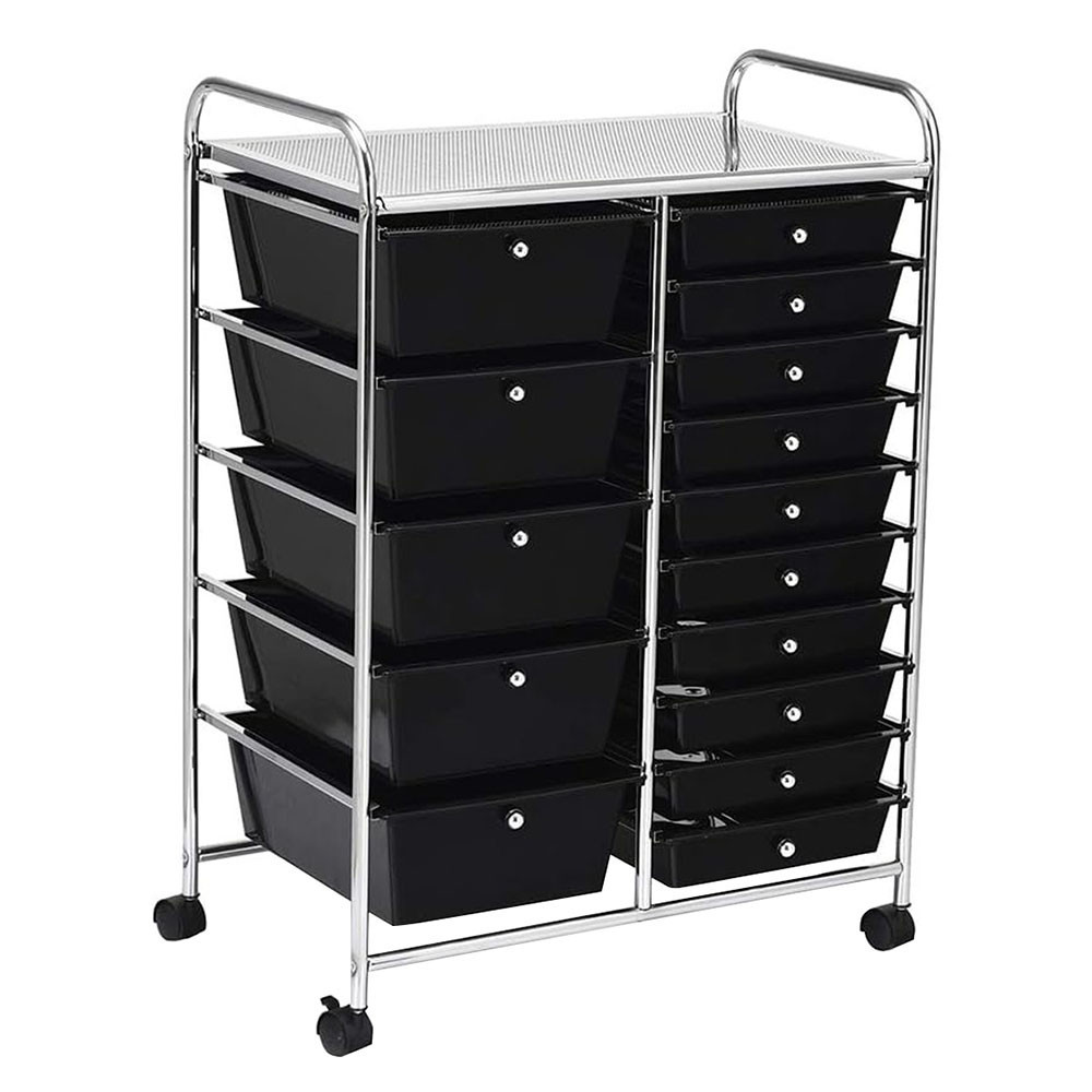 Úložný vozík disponuje celkovo 15 zásuvkami, ktoré vám umožnia triediť veci podľa kategórií. Menšie zásuvky sú ideálne na drobnosti, kancelárske potreby alebo kozmetické doplnky, zatiaľ čo do väčších zásuviek pohodlne uložíte aj rozmernejšie predmety.