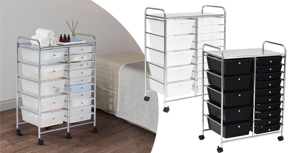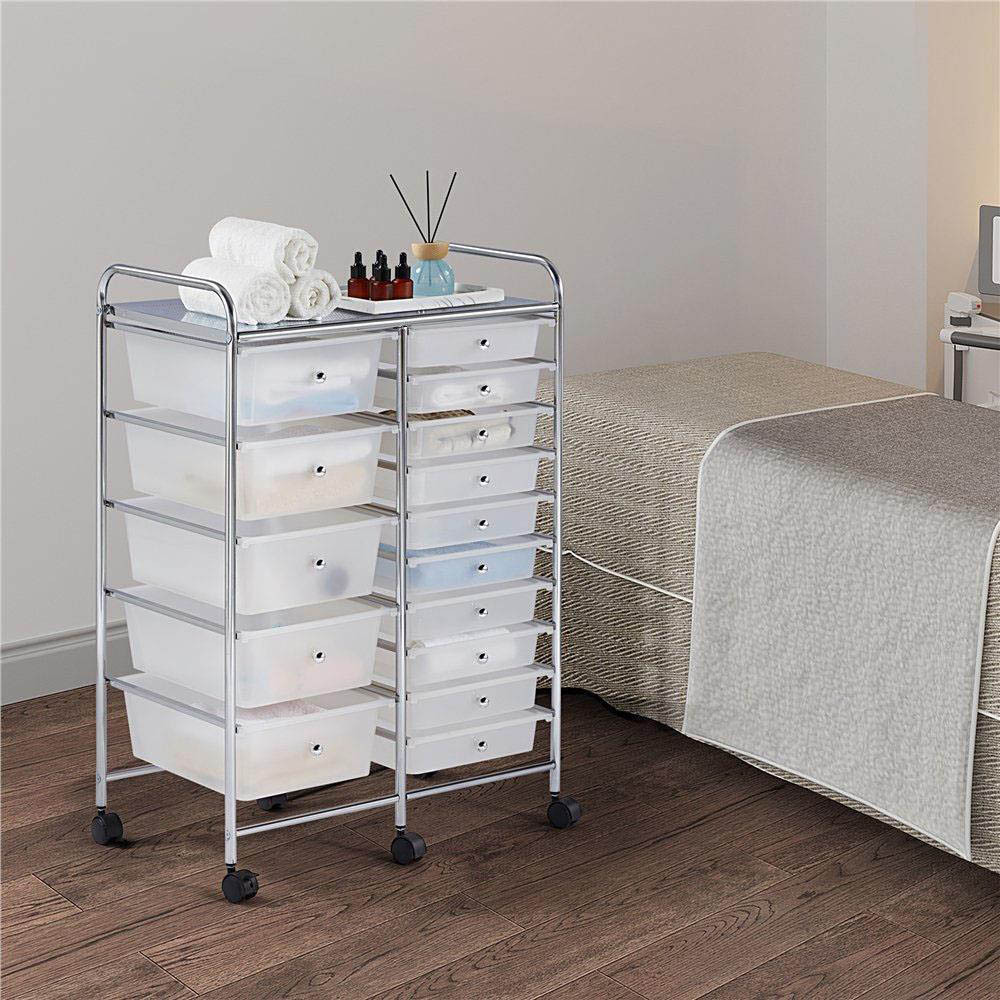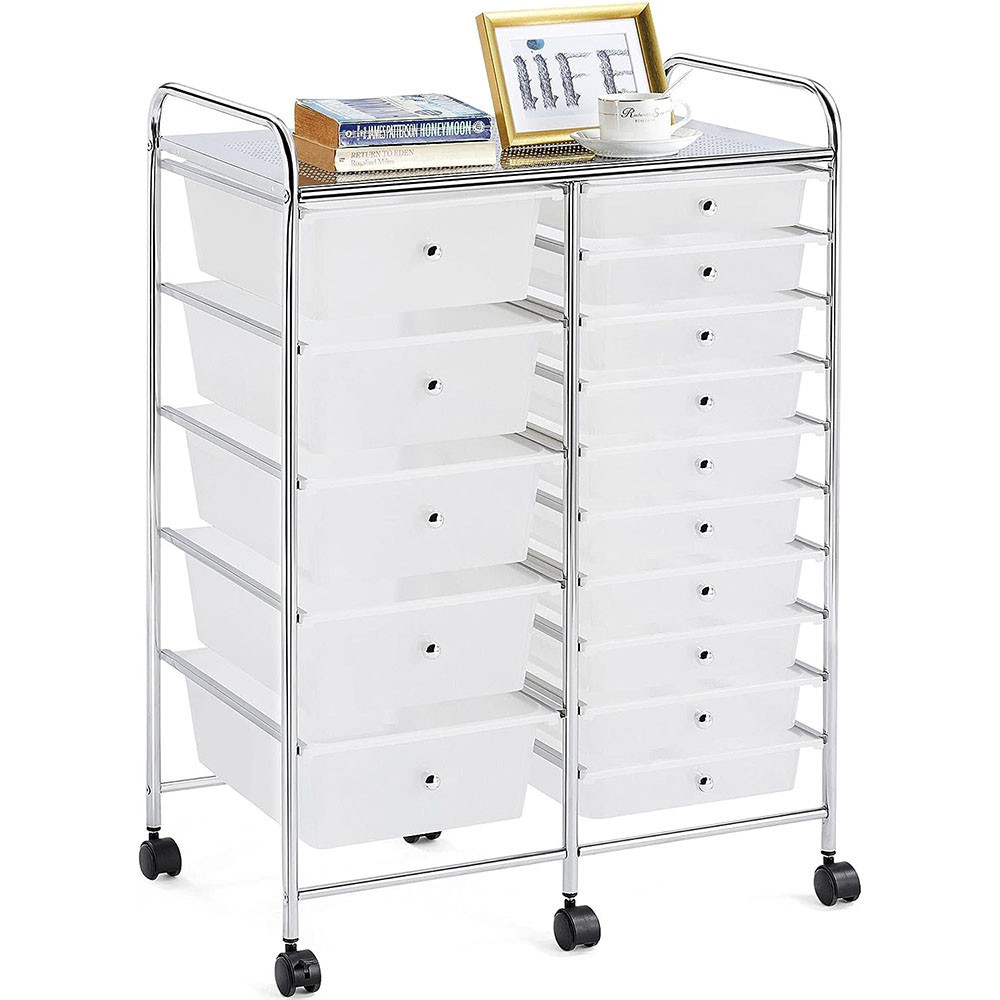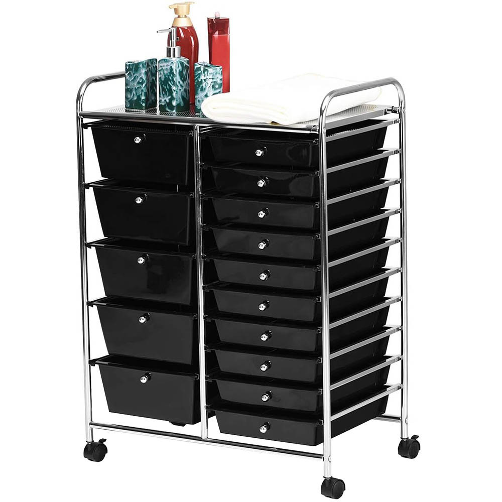 Úložný vozík disponuje celkovo 15 zásuvkami, ktoré vám umožnia triediť veci podľa kategórií. Menšie zásuvky sú ideálne na drobnosti, kancelárske potreby alebo kozmetické doplnky, zatiaľ čo do väčších zásuviek pohodlne uložíte aj rozmernejšie predmety.