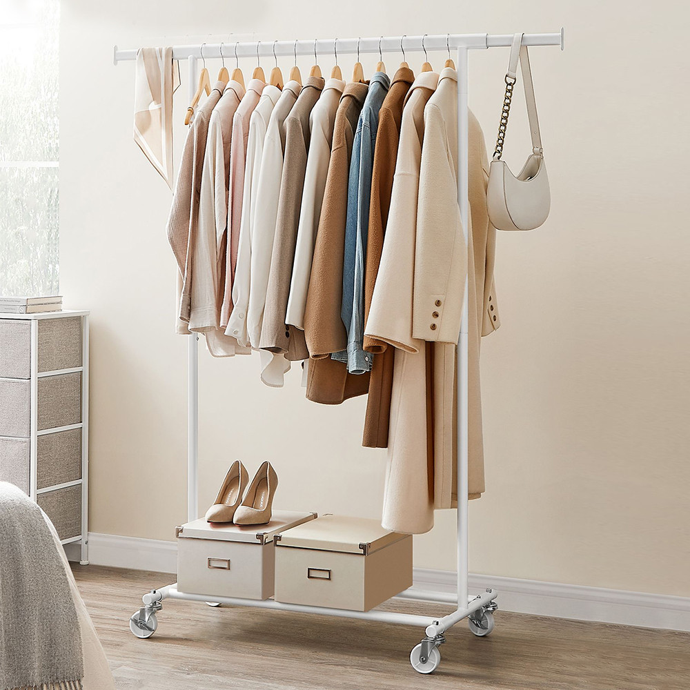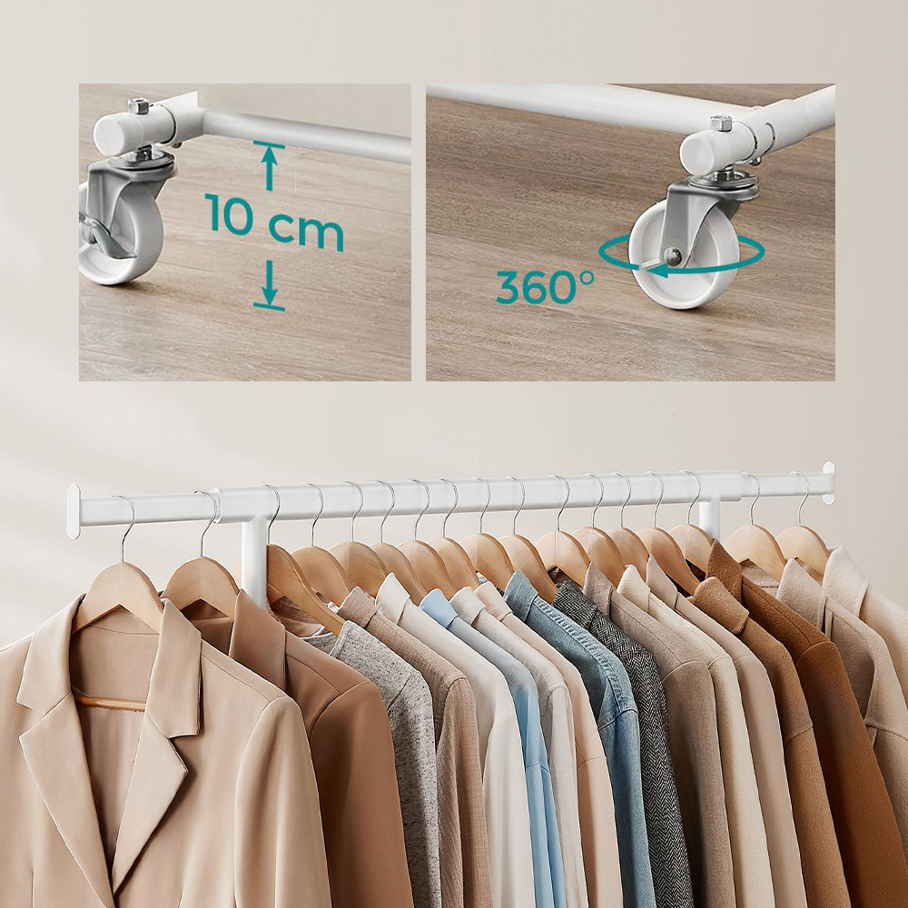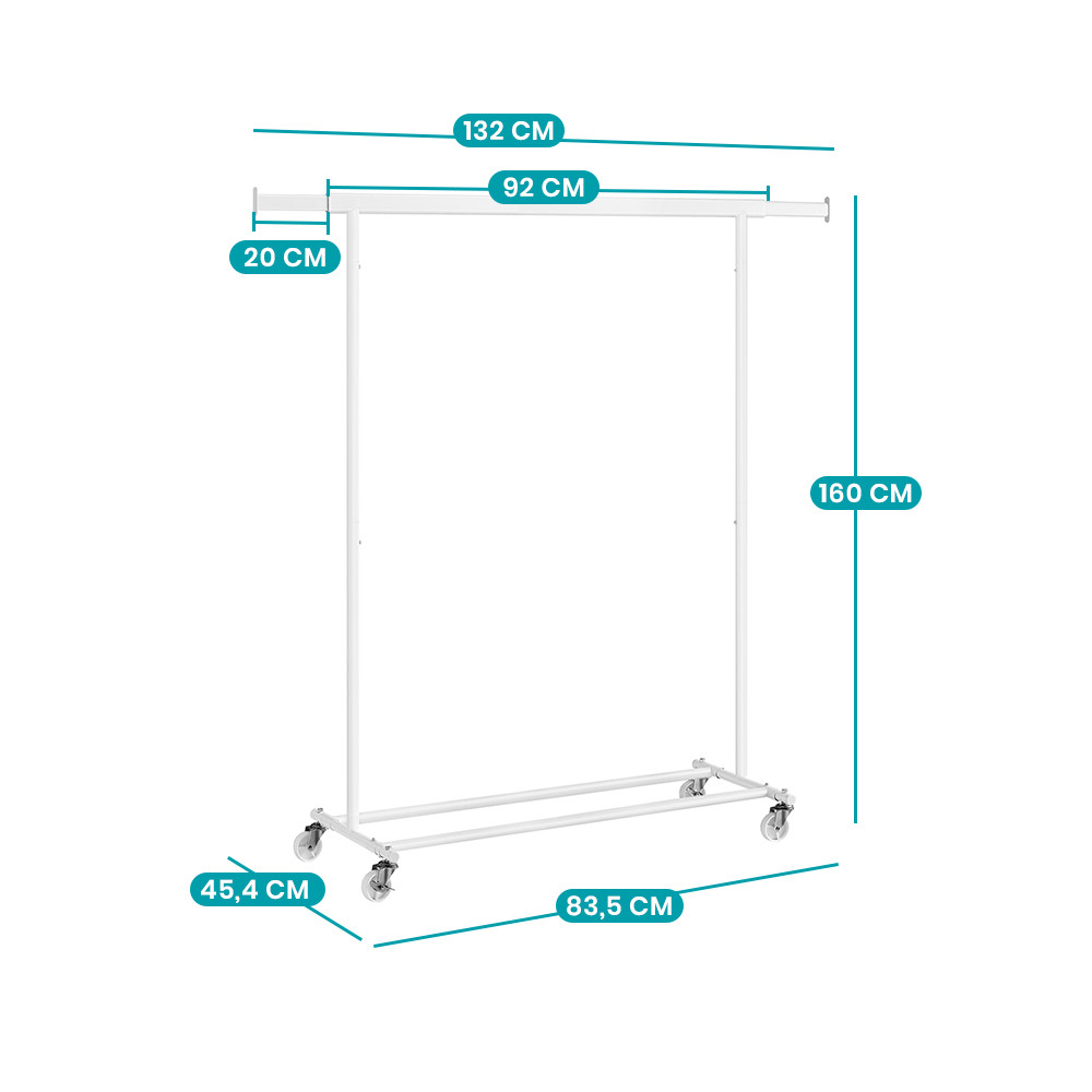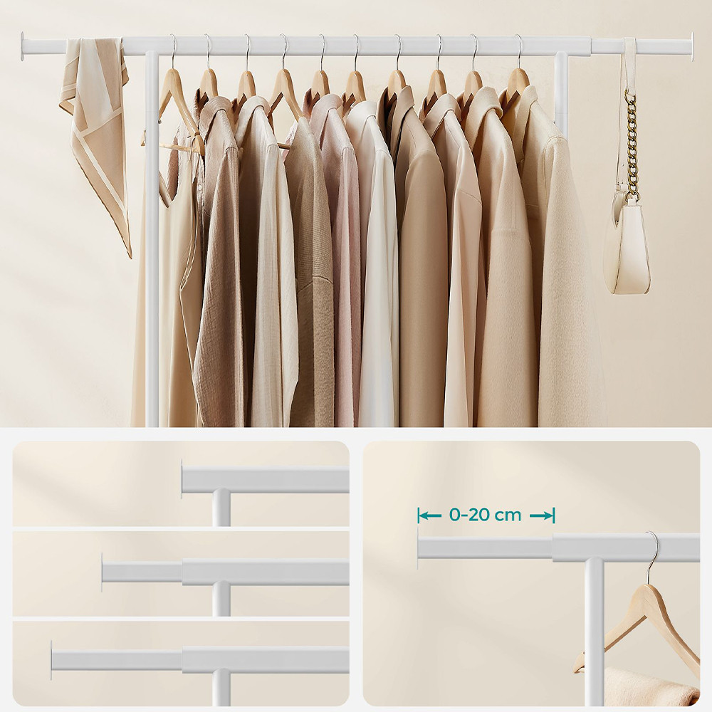 Horná tyč je nastaviteľná v rozmedzí 92 – 132 cm, takže ponúka dostatok priestoru pre rôzne typy oblečenia. Bočné výsuvy sú ideálne na zavesenie tašiek, šálov alebo klobúkov.