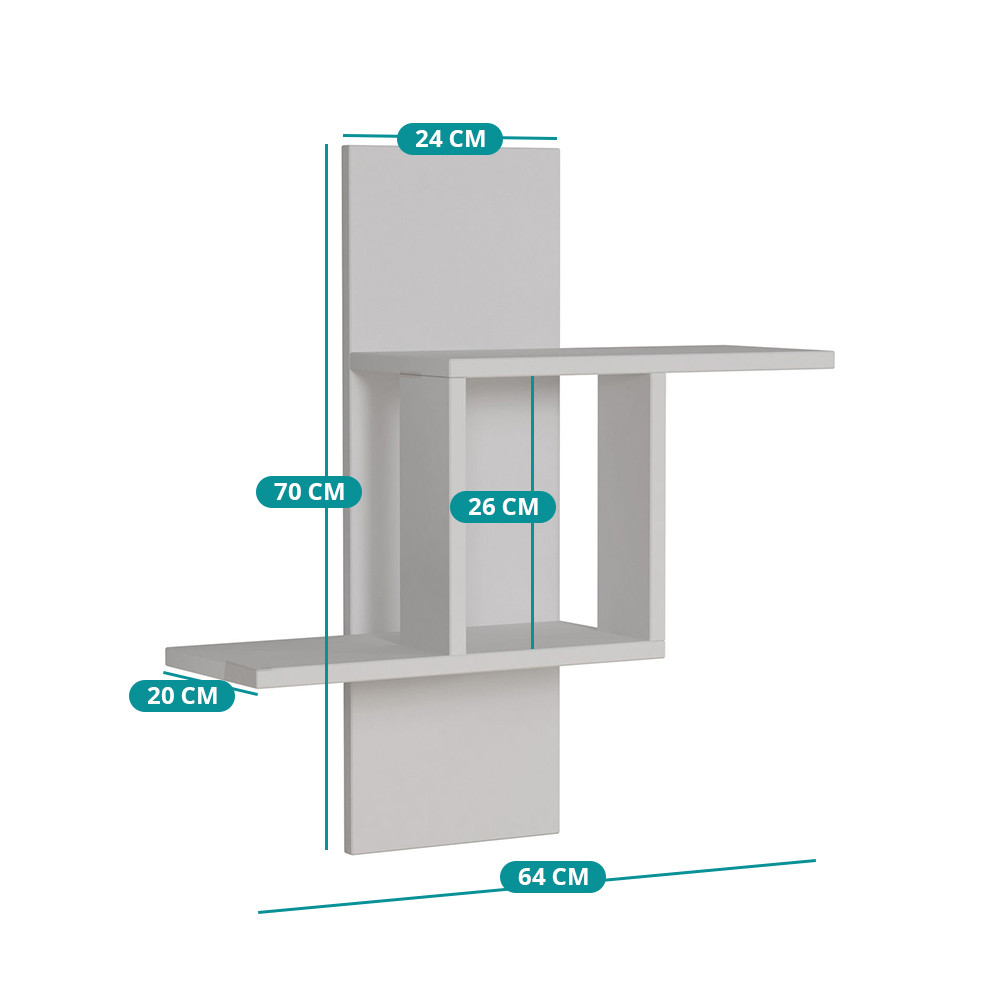 Biela nástenná polica vytvára svetlú a sviežu atmosféru so svojím čistým vzhľadom. Jej geometrický dizajn nielenže slúži praktickému účelu, ale aj zvýrazňuje stenu ako dekoratívny prvok.