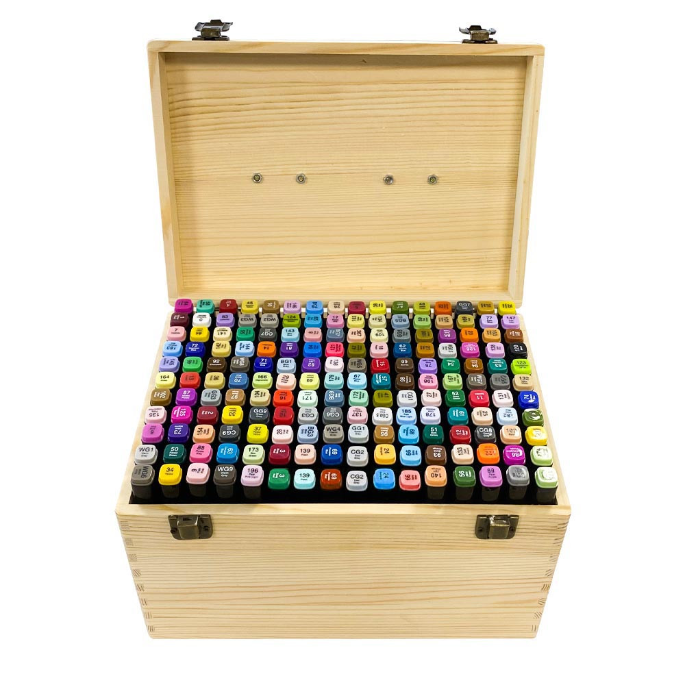 Odolná drevená škatuľa s kovovým zatváraním a pohodlnou rukoväťou umožňuje jednoduché prenášanie a bezpečné uloženie fixiek. Vďaka nej budú vždy prehľadne usporiadané a chránené pred poškodením.