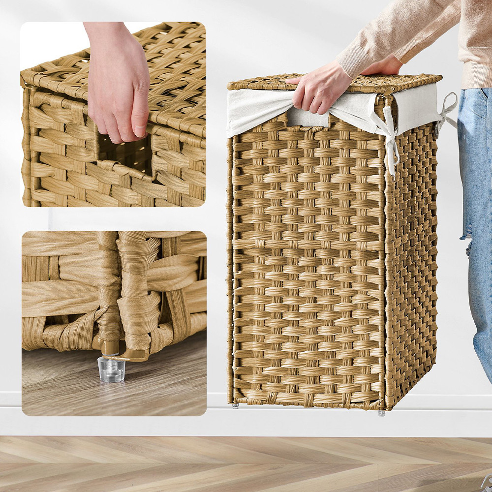 Tento 90-litrový kôš na bielizeň s ratanovým efektom je elegantným doplnkom každej spálne či kúpeľne. Prírodný vzhľad výpletu a moderný tvar harmonicky zapadne do každého interiéru a zároveň udrží oblečenie usporiadané.