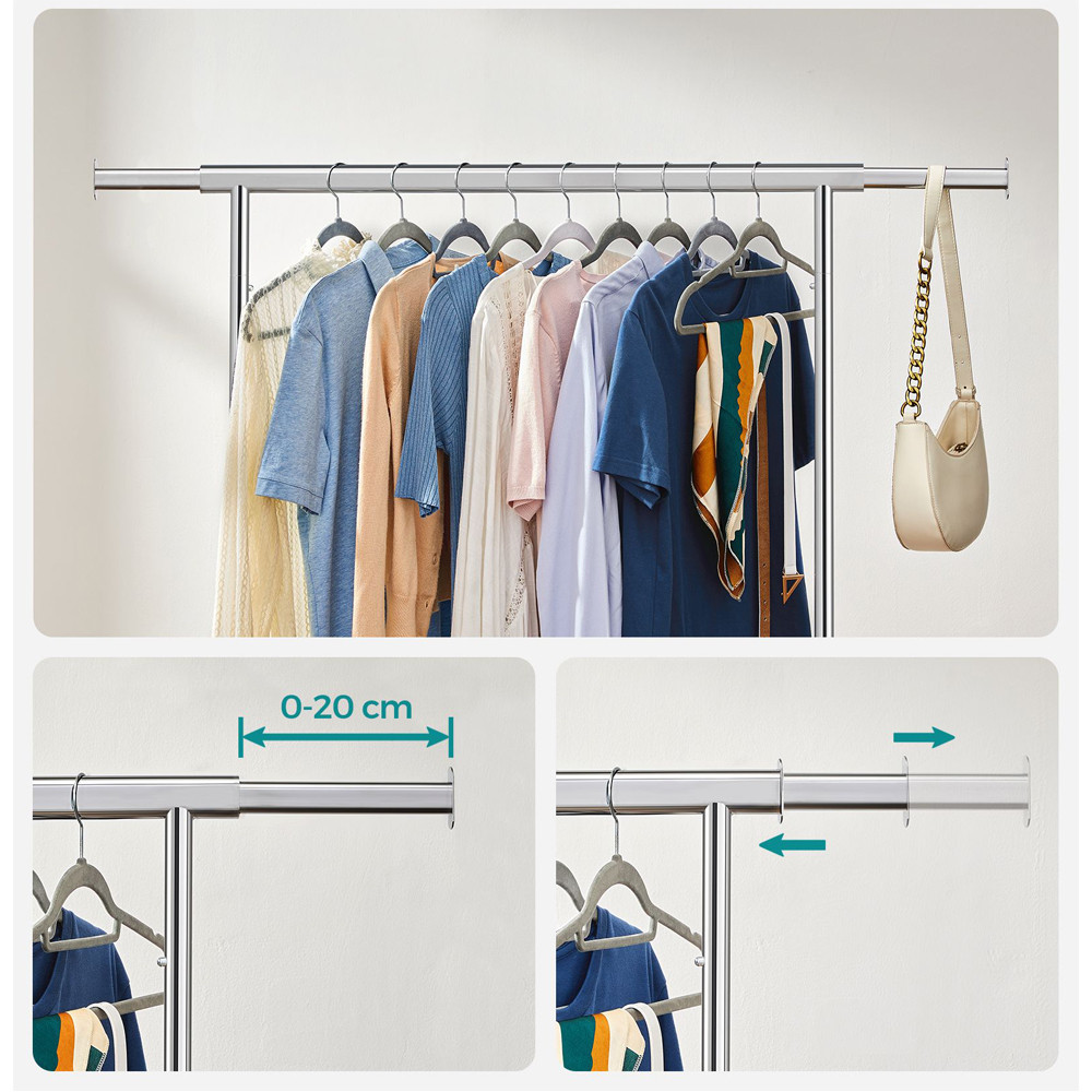 Horná tyč sa dá na oboch stranách predĺžiť o 20 cm, takže pojme viac oblečenia, a na koncoch si pohodlne zavesíte tašky alebo šatky. Pod spodné tyče môžete umiestniť úložné boxy.