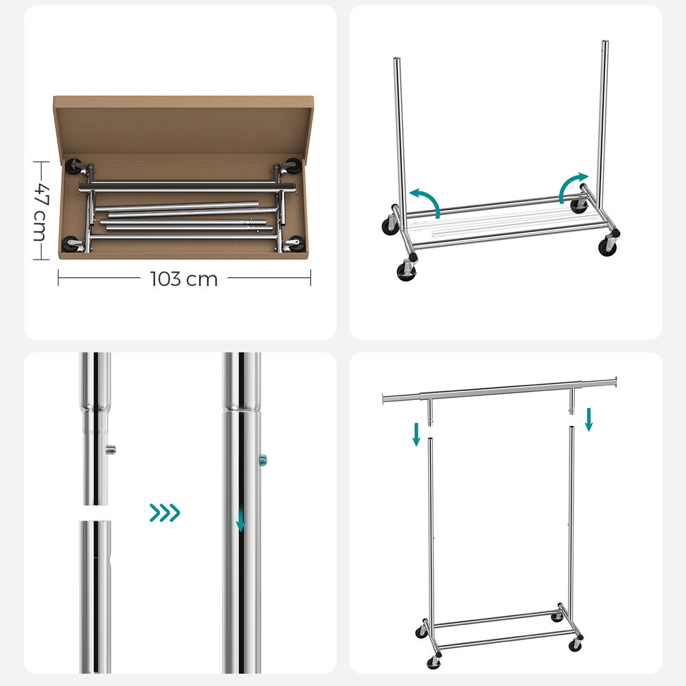 Zo 4 koliesok otočných o 360° sú 2 vybavené brzdou, takže stojan ľahko presuniete a bezpečne zafixujete. Chrómovaná oceľová konštrukcia ponúka trvácny a estetický vzhľad, vhodný aj na vonkajšie použitie.