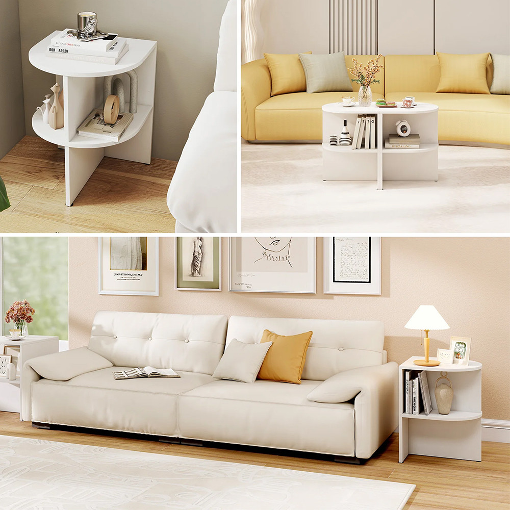 Polkruhový tvar umožňuje používať stolík samostatne vedľa pohovky alebo steny, ale kombinovaním dvoch kusov môžete vytvoriť aj okrúhly kávový stolík.