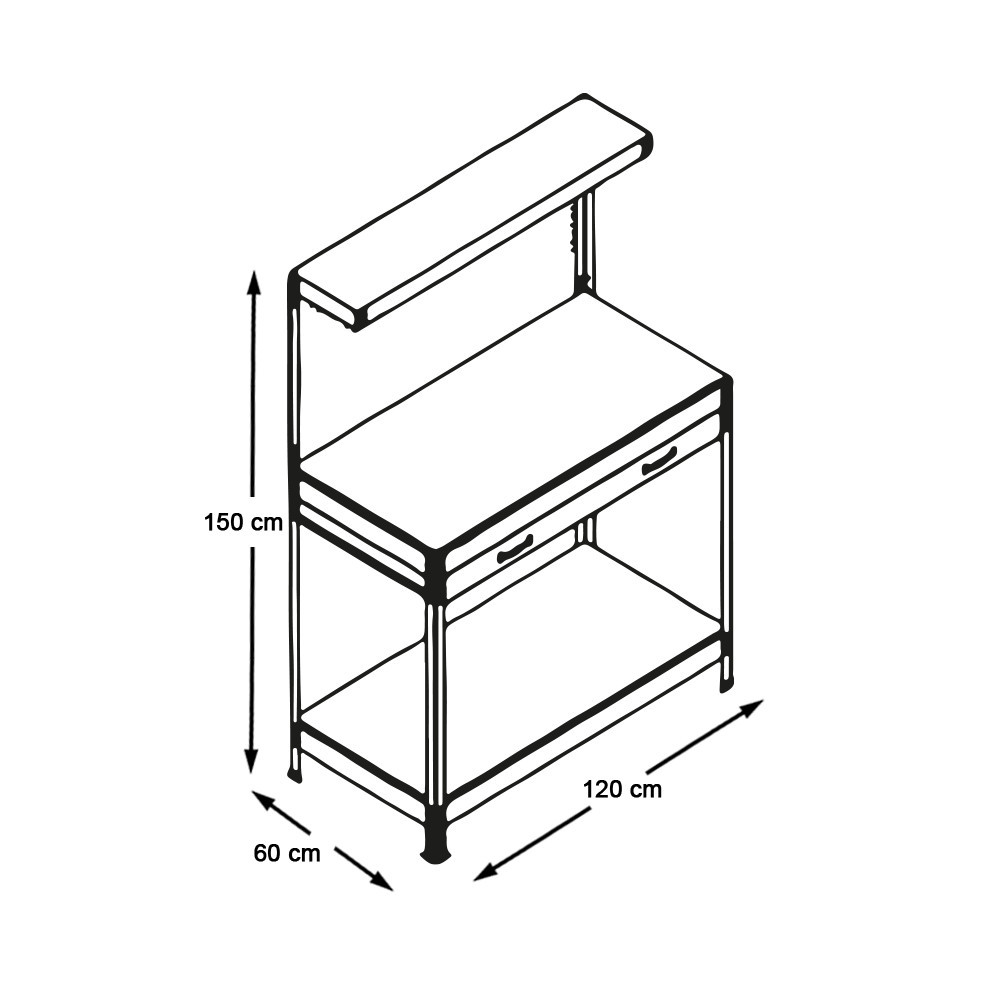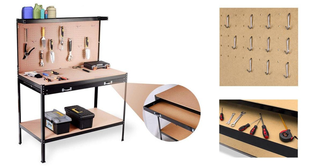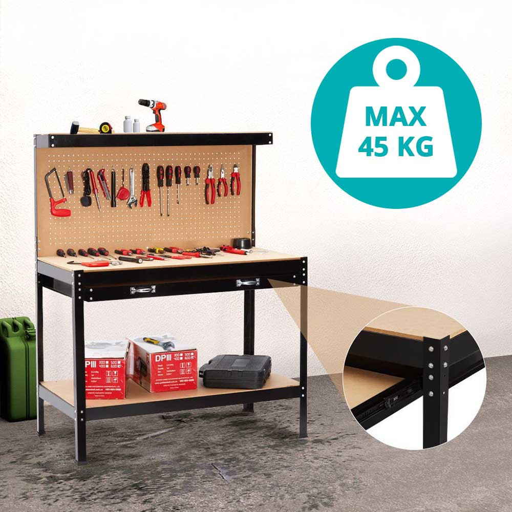 Pracovný stôl disponuje veľkou úložnou zásuvkou, ktorá je ideálna na skrutkovače, menšie náradie alebo ďalšie doplnky. Spodná polica ponúka ďalší úložný priestor na menšie stroje alebo materiály, takže všetko zostane na dosah ruky počas práce.