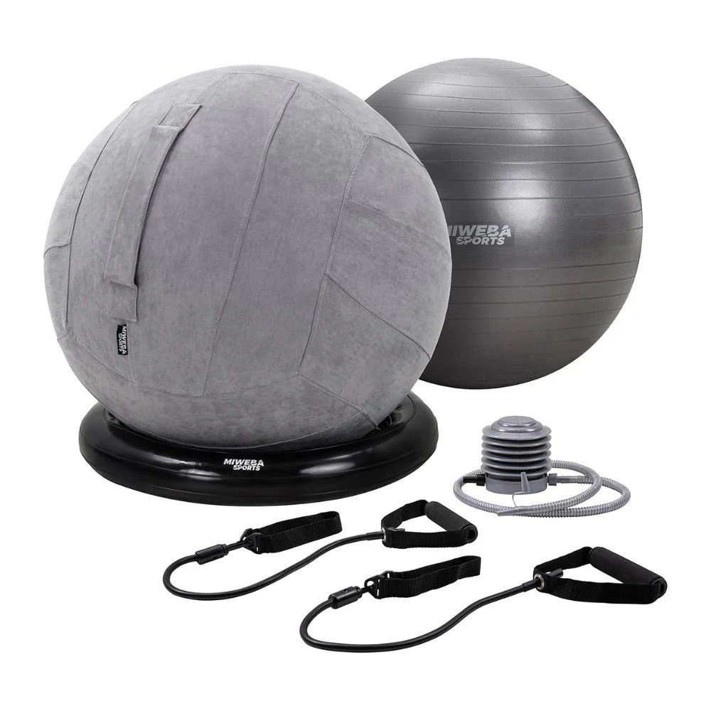 Sada obsahuje všetko potrebné príslušenstvo pre praktické použitie. Podložka pod loptu zabraňuje jej odvaleniu pri sedení, ručná pumpa umožňuje rýchle nafúknutie lopty a expanderové pásy poskytujú ďalšie možnosti cvičenia.