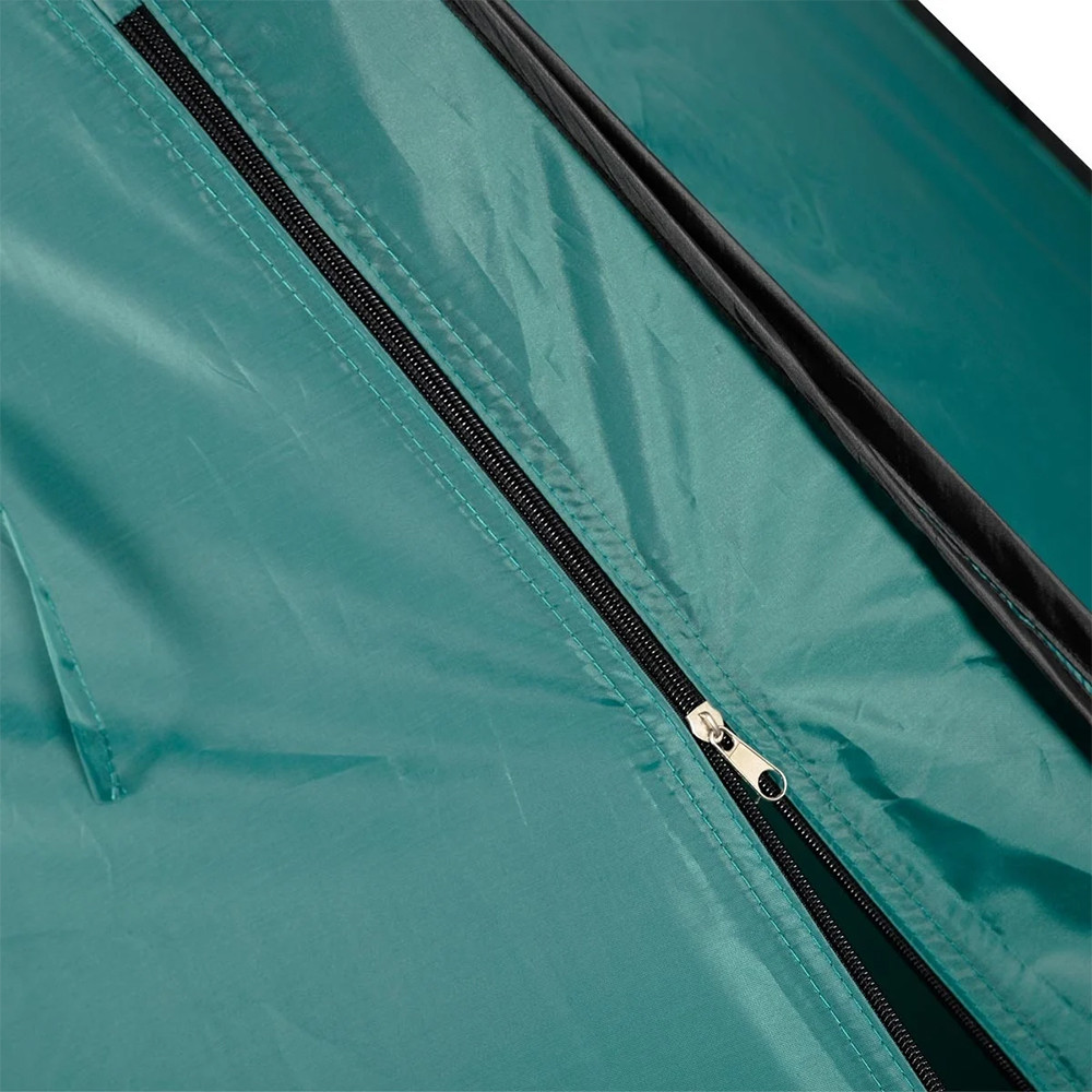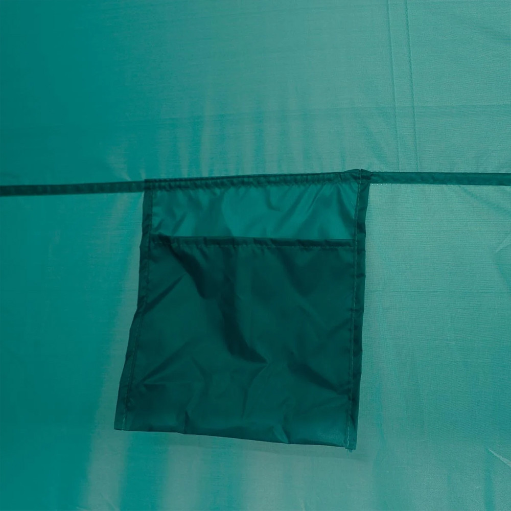 Vo vnútri nájdete vrecko na drobnosti a háčik na šampón alebo sprchový gél. Stan sa upevňuje pribalenými kolíkmi, aby bol stabilný pri vonkajšom používaní.