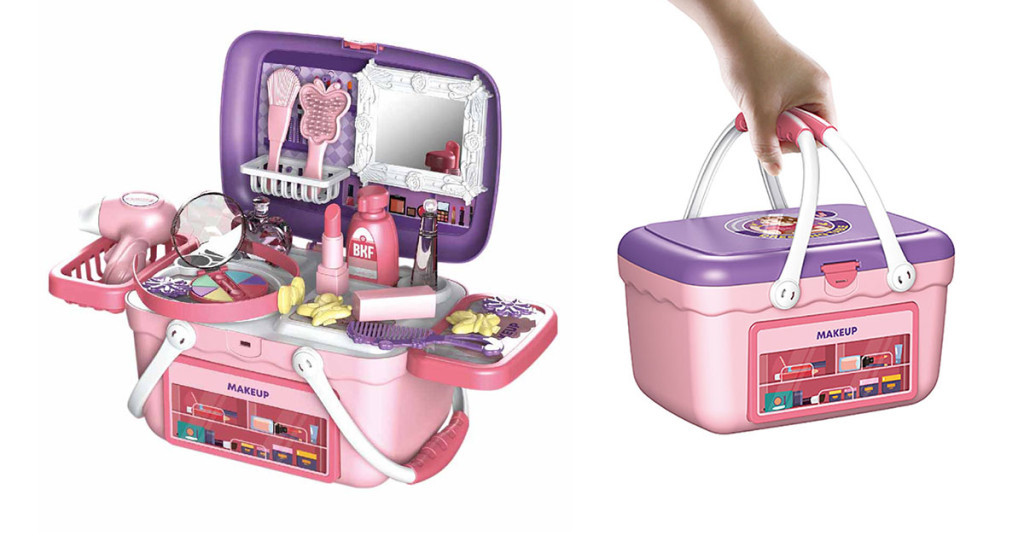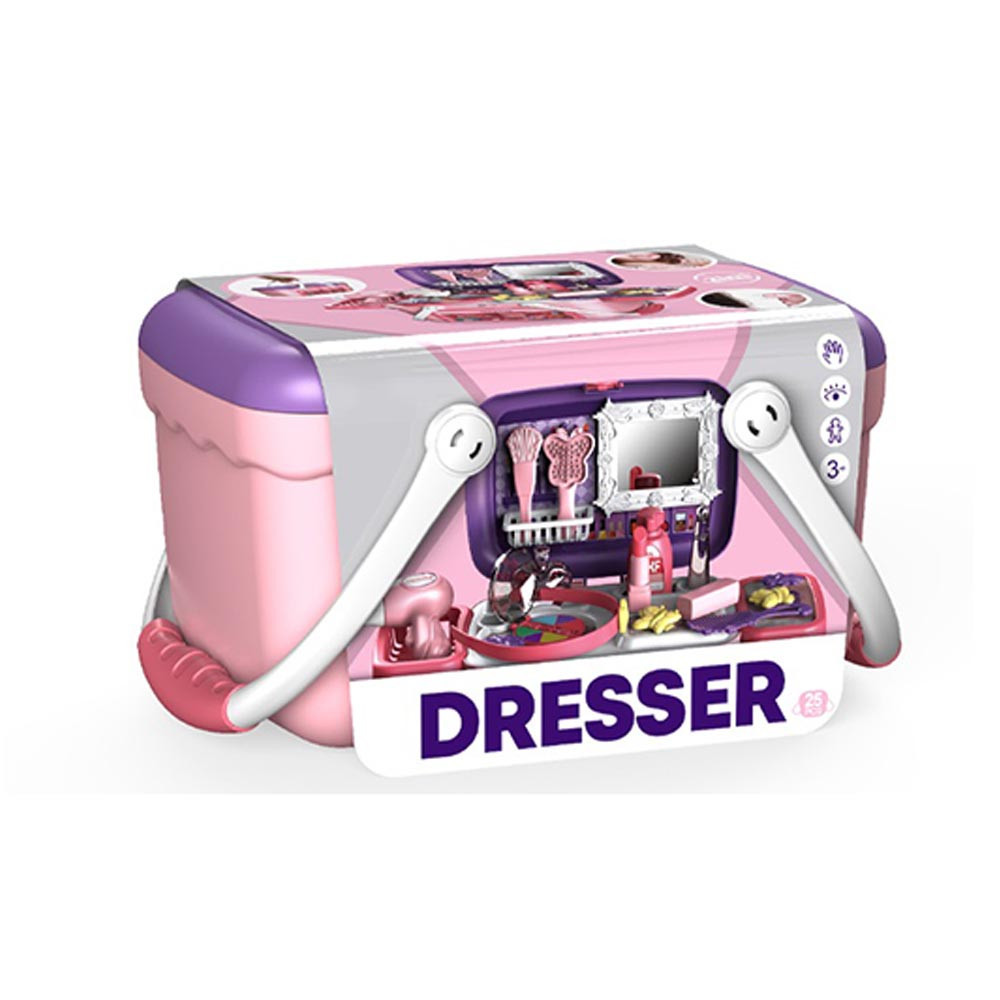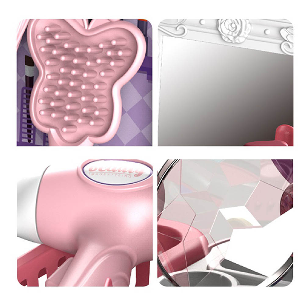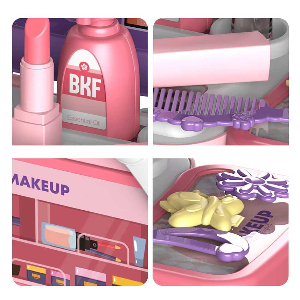 Skrášľovacia súprava pre deti bude čoskoro veľkým favoritom každého malého dievčatka! Skladací box sa ľahko prenáša vďaka otvárateľným rukovätiam, takže si ho deti môžu vziať kamkoľvek so sebou. Jeho malé košíky a držiaky, ako aj samolepky s vyobrazením toaletných potrieb navodzujú atmosféru skutočného salónu krásy. Otvorený box obsahuje veľa realistických predmetov a doplnkov, ako je malé zrkadlo, paletka na líčenie a sušič vlasov.