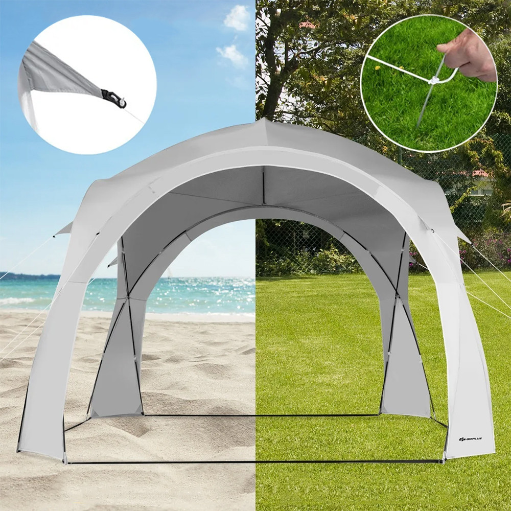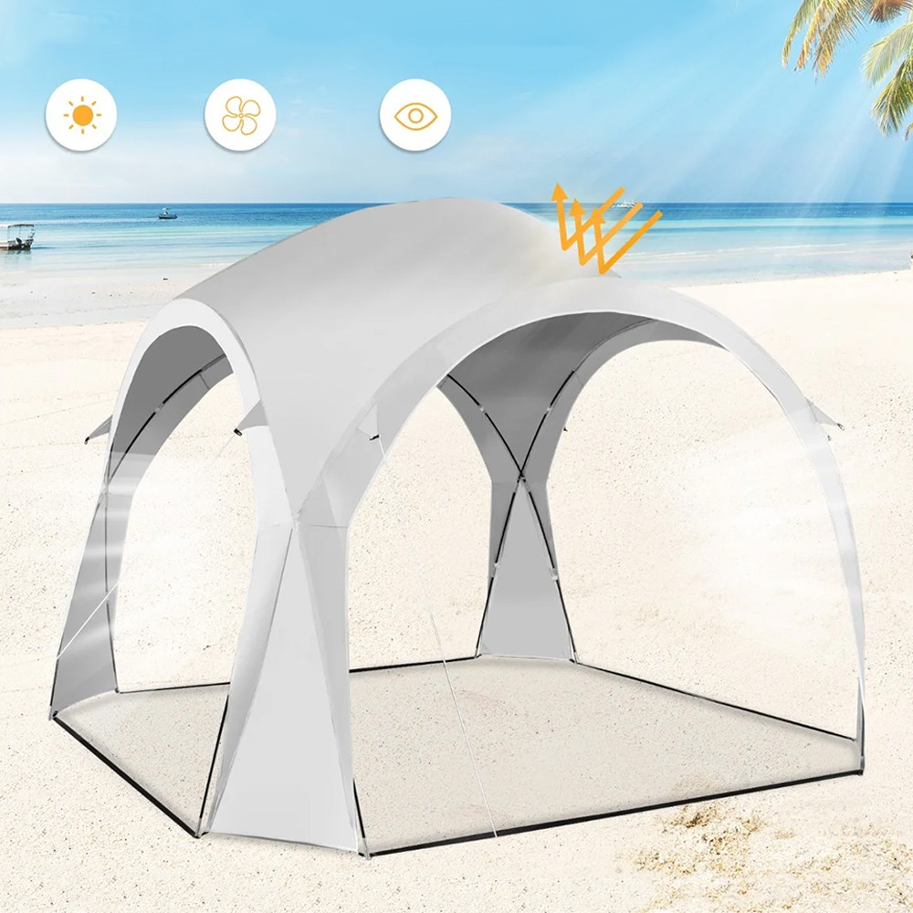 Zakrivený tvar strechy a pevný biely vzhľad vytvárajú elegantný efekt, ktorý sa hodí do rôznych vonkajších prostredí – či už na pláži, v parku alebo v záhrade.