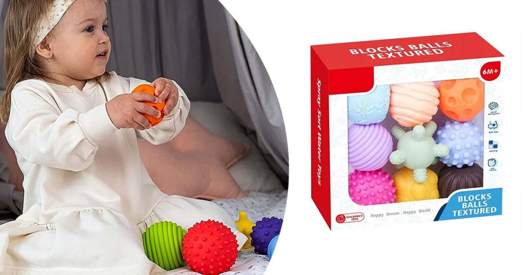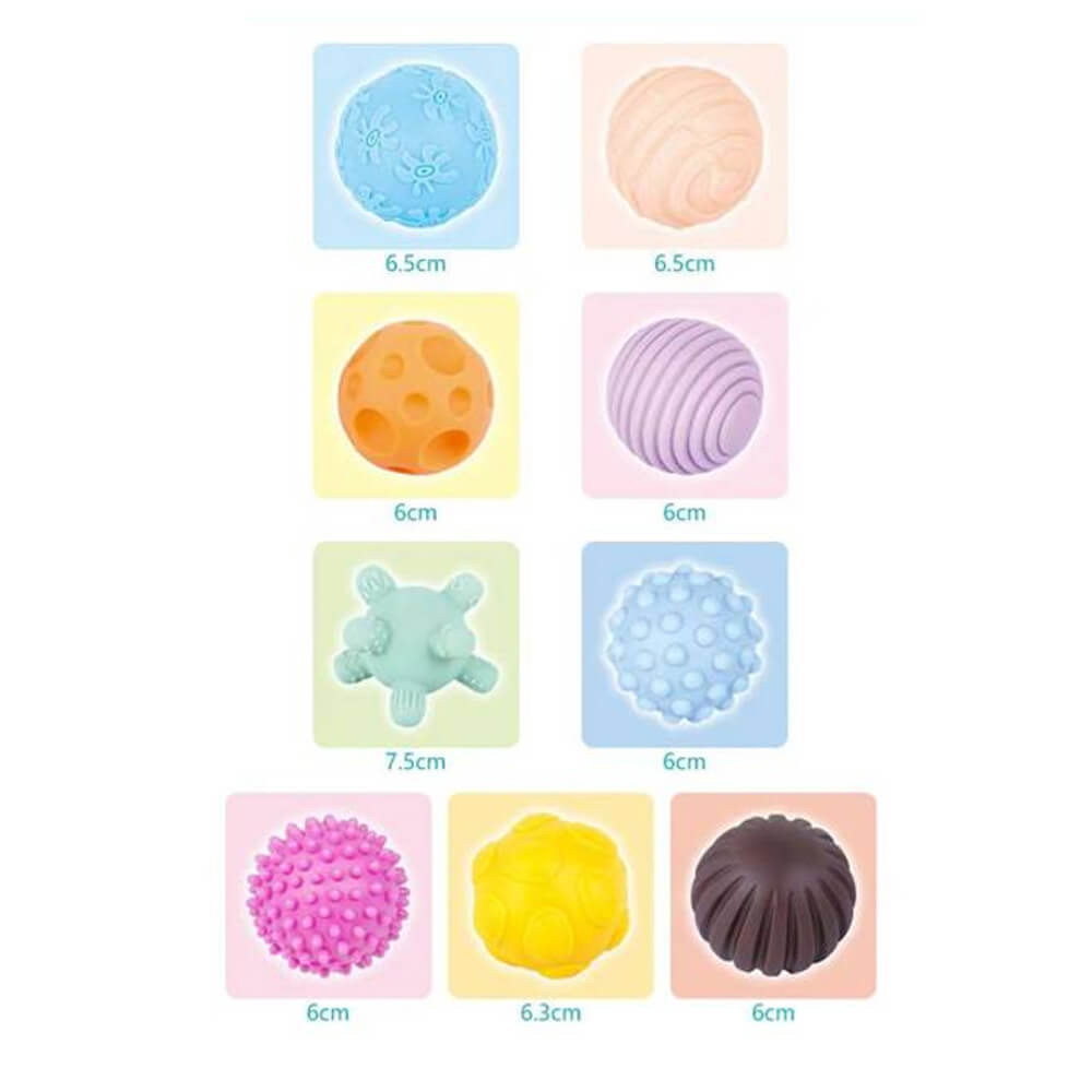 Súprava obsahuje 9 loptičiek s rôznymi textúrami a vzormi, ktoré podporujú rozvoj hmatových schopností bábätka. Mäkké, drážkované, jamkované alebo jemne štruktúrované povrchy poskytujú nové podnety pre malé detské rúčky. To napomáha rozvoju jemnej motoriky a zlepšuje koordináciu rúk a očí.