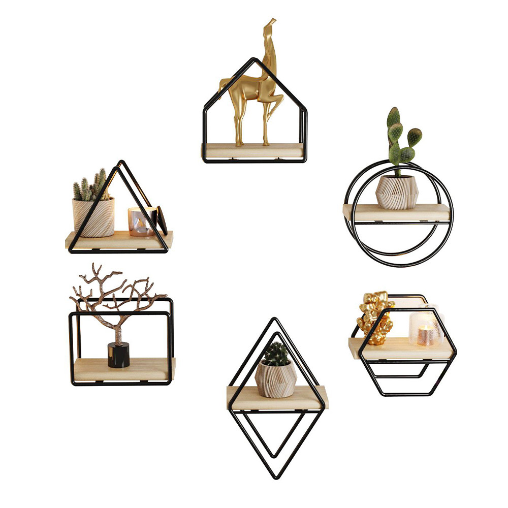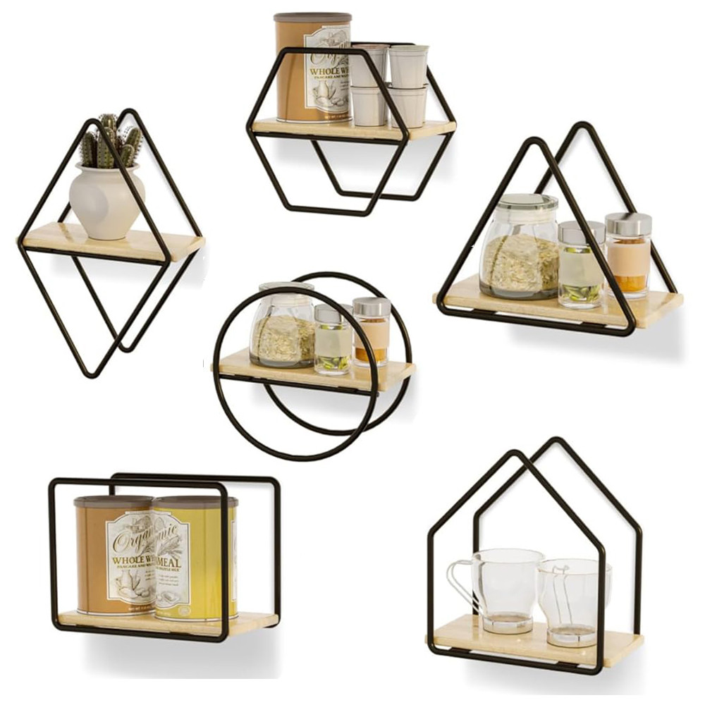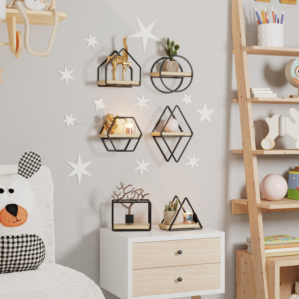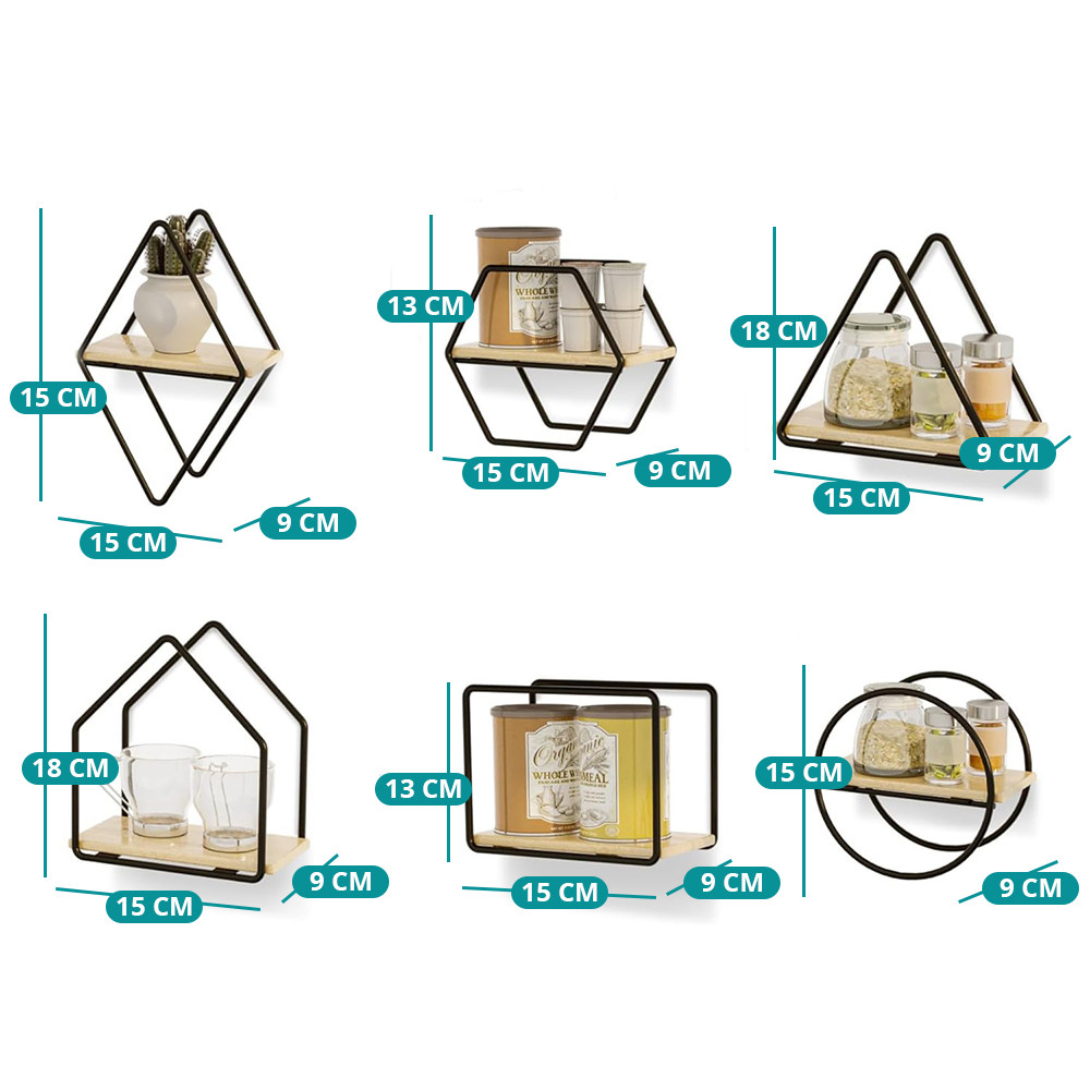 Rôzne geometrické tvary súpravy nástenných políc 6 kusov vám umožňujú vytvoriť pôsobivú a hravú kompozíciu na vašej stene. Môžete ich usporiadať spolu alebo samostatne, čo vám umožní plne prispôsobiť vzhľad.