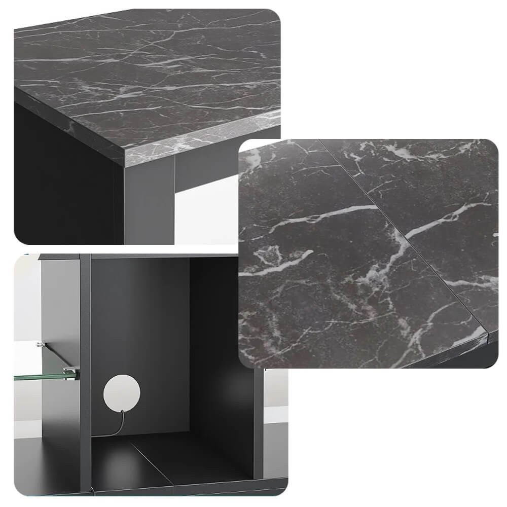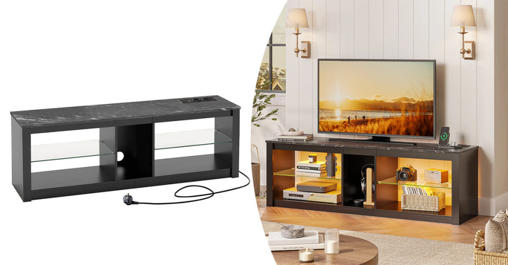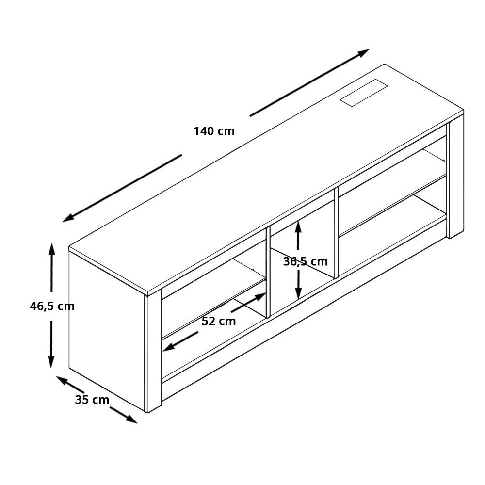 Policová konštrukcia stojana ponúka dostatok miesta na multimediálne zariadenia, diaľkové ovládače, herné konzoly a ďalšie príslušenstvo. Stredné a spodné úložné priestory umožňujú organizované uskladnenie, zatiaľ čo zabudované elektrické zásuvky a USB 2.0 porty zjednodušujú nabíjanie a pripojenie zariadení.